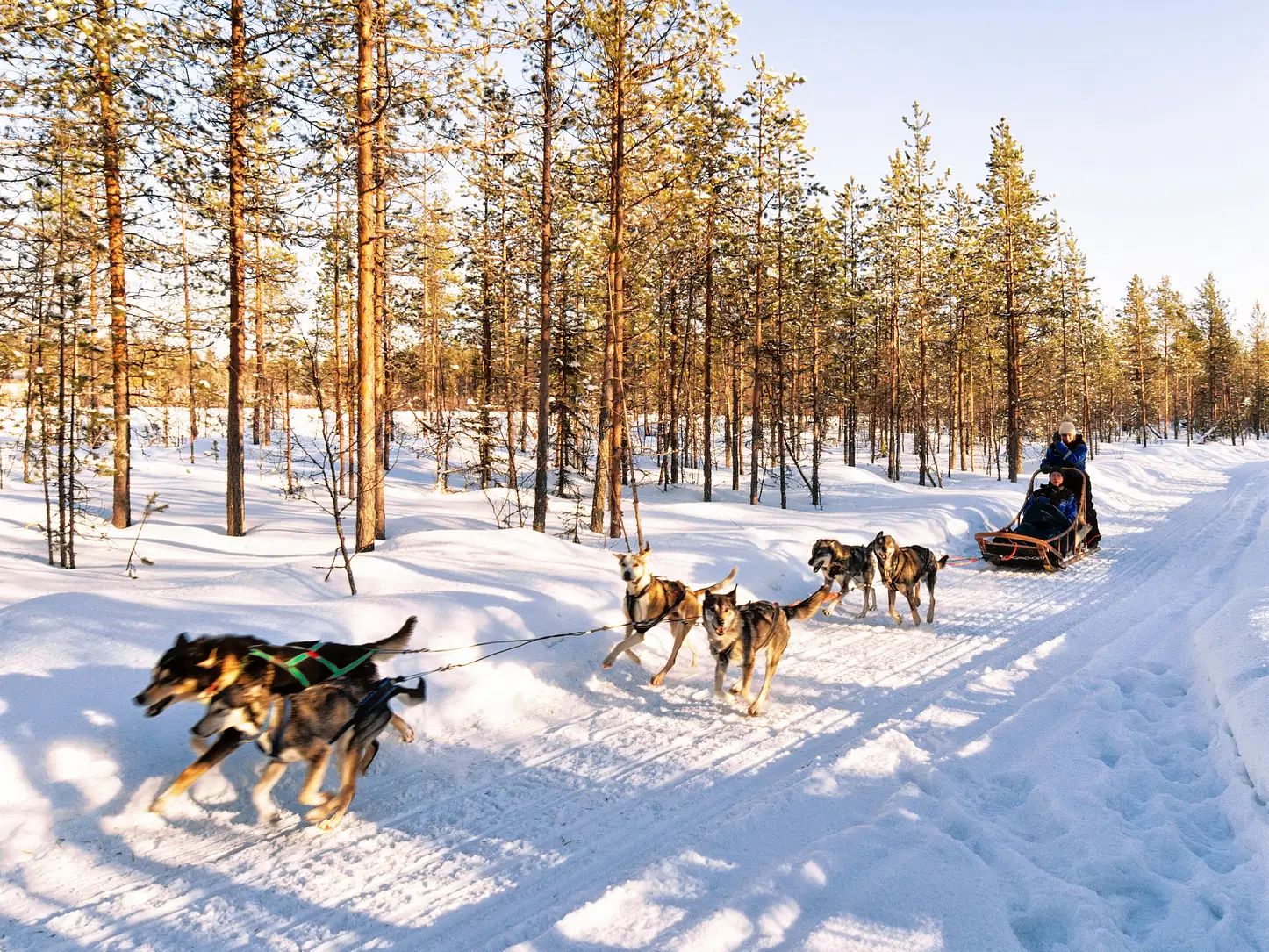 Uma magnífica experiência no cenário invernal espera por você a bordo de um trenó puxado por huskies. O musher (condutor) lhe dará as boas-vindas na recepção do resort e o acompanhará até o canil, onde os huskies do Alasca o receberão com alegria. Ele também mostrará como conduzir seu próprio trenó. Agora você está pronto para sair e desfrutar da natureza e do silêncio, enquanto os huskies percorrem as trilhas de inverno em uma jornada inesquecível. Após o percurso, retornaremos ao canil para desfrutar de bebidas quentes ao redor da fogueira, enquanto ouvimos histórias sobre os huskies.